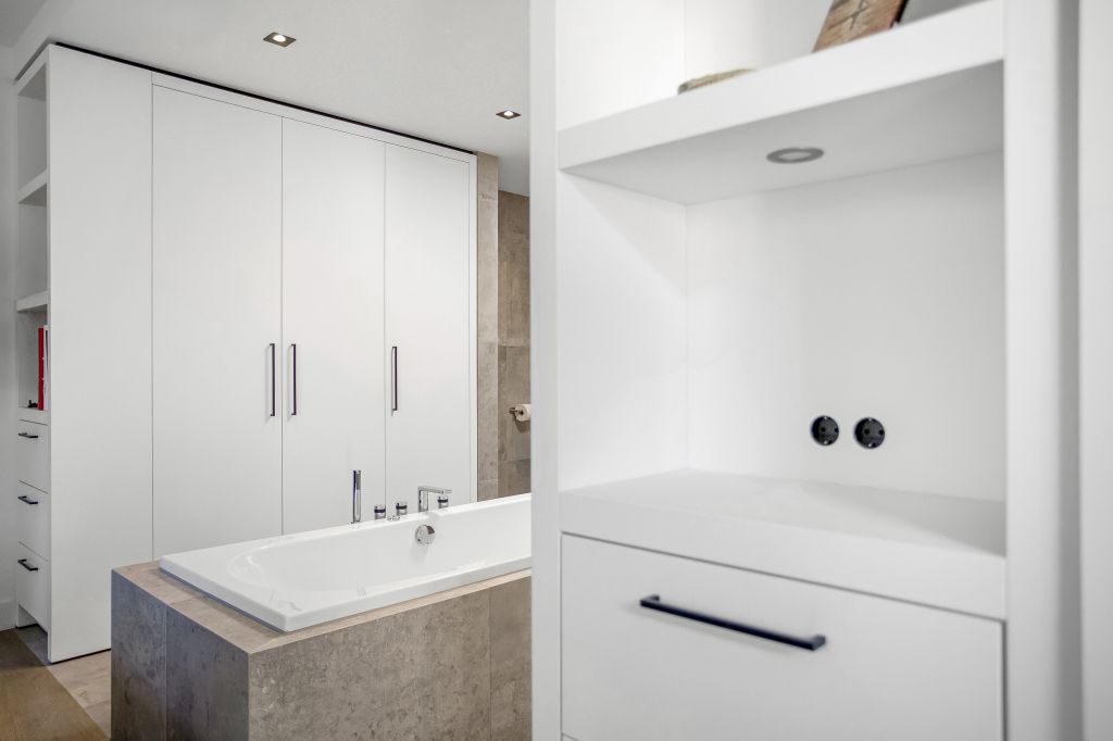 De hoge kasten zijn uitgevoerd in strak wit en zorgen voor een lichte, ruimtelijke uitstraling met volop praktische opbergruimte. Het badmeubel in warm hout vormt een mooi contrast en brengt juist een natuurlijke en uitnodigende sfeer in de ruimte.