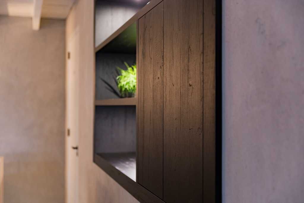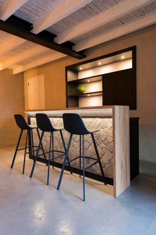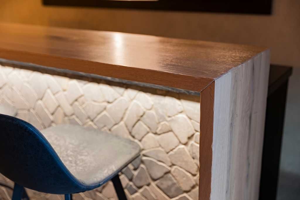 De barombouw is uitgevoerd in massief eiken en op kleur gebracht voor een warme en persoonlijke uitstraling. Het barblad met stenen afwerking geeft het geheel een robuust en luxe karakter, terwijl de omlijsting in houtdecorplaat zorgt voor een mooie verbinding met de nis in de achterwand.