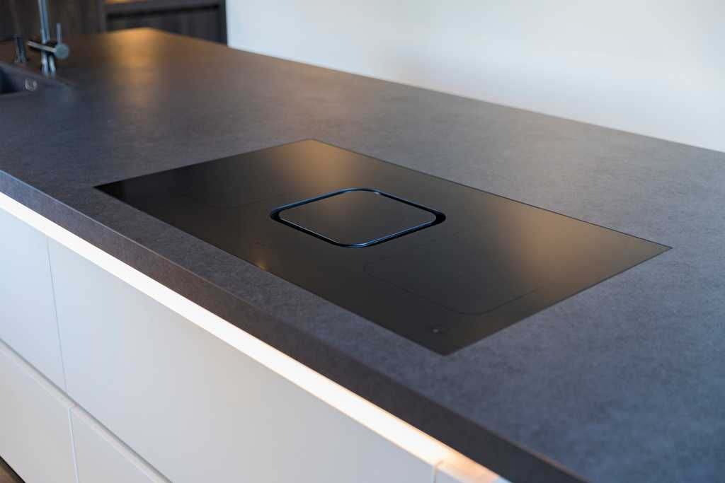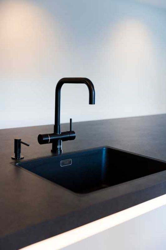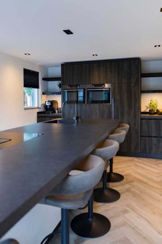 Het werkblad, de vensterbanken en plinten zijn uitgevoerd in Dekton Eter met een royale dikte van 50 mm, wat zorgt voor een krachtige en luxe uitstraling. In combinatie met de Franke spoelbak en Atlas Neo kraan in Industrial Black ontstaat een stijlvol en eigentijds geheel.