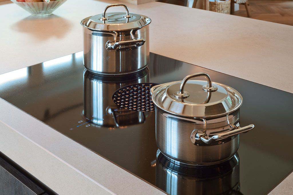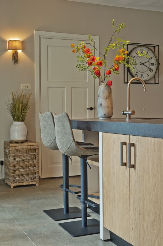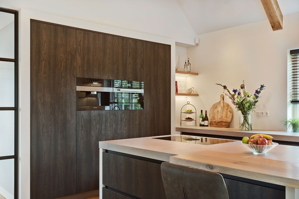 Metalen grepen naar keuze en de massief uitgevoerde Corian kolommen met subtiele schaduwrand geven de keuken een exclusief en verfijnd karakter. Het werkblad in Dekton Kovik Natural, uitgevoerd in 60 mm en verstek verlijmd, vormt een robuuste en luxe basis.