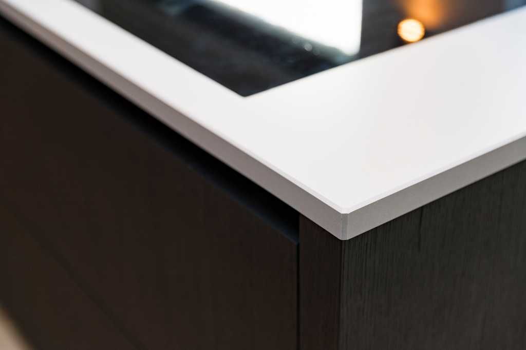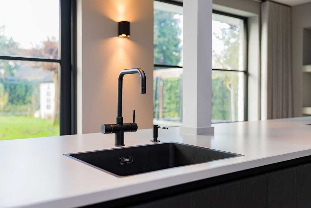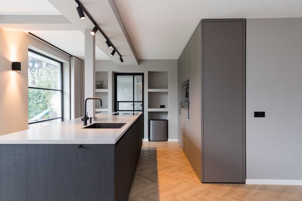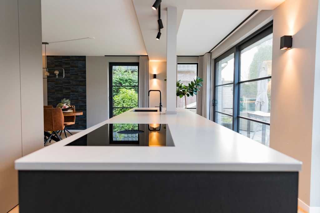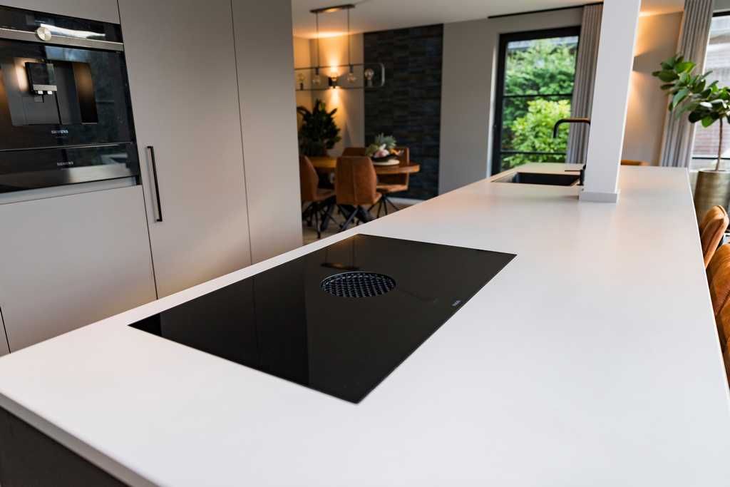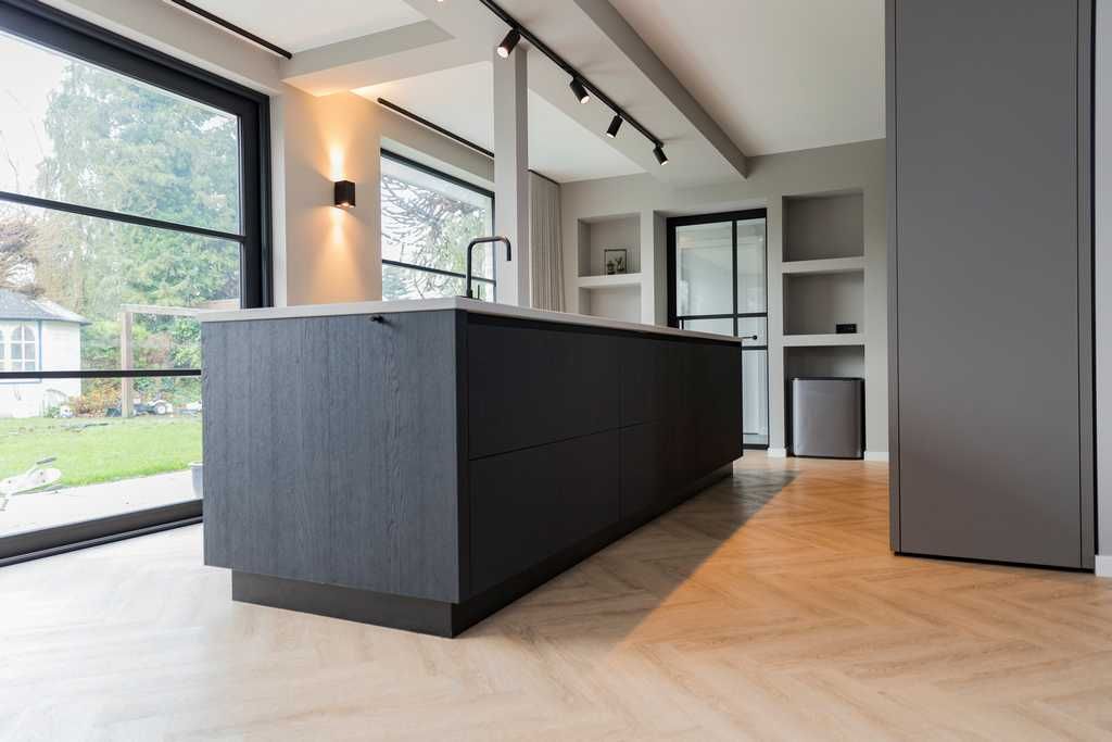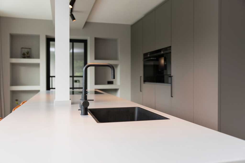 Het royale kookeiland vormt het hart van de ruimte en combineert ruime bergruimte met een krachtige en eigentijdse uitstraling. Het werkblad is uitgerust met een vlakinbouw kookplaat, luxe spoelbak en multifunctionele kraan, zodat koken en werken in de keuken moeiteloos samenkomen.