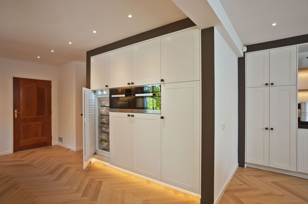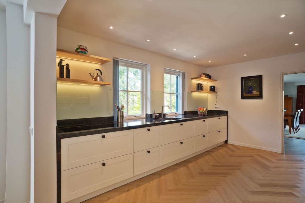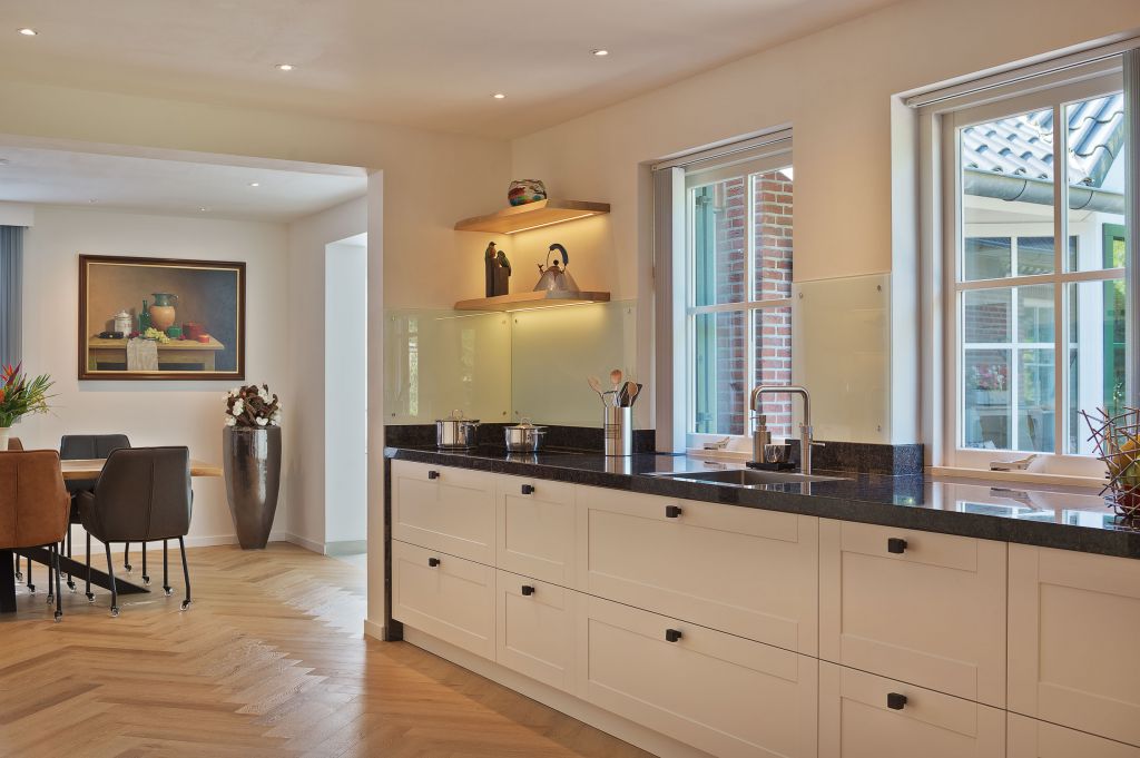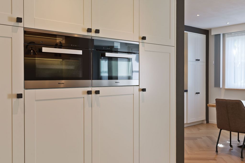 De kasten zijn uitgevoerd in waterwerend wit MDF met stijlvolle kaderdeurtjes en zwarte knopjes, wat samen met het zwarte werkblad zorgt voor een krachtig en elegant contrast. Het ontwerp straalt warmte en karakter uit en biedt volop bergruimte met ruime lades, kastruimte en naadloos geïntegreerde apparatuur.