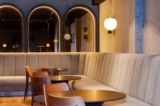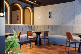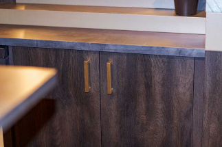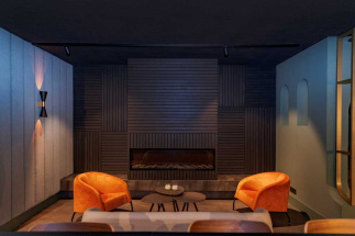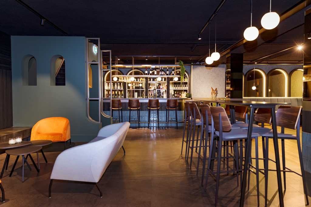 Deze ruimte compleet voorzien van een op maat gemaakt interieur door van Hoof interieurbouw. Denk hierbij aan de gestoffeerde banken/ gestoffeerde wand panelen, bar, rek boven de bar, de ronde togen tegen de wanden, wand rekken, wand bekleding, kastwerk en haard ombouw. Al met al een prachtig geheel, al zeggen we het zelf.