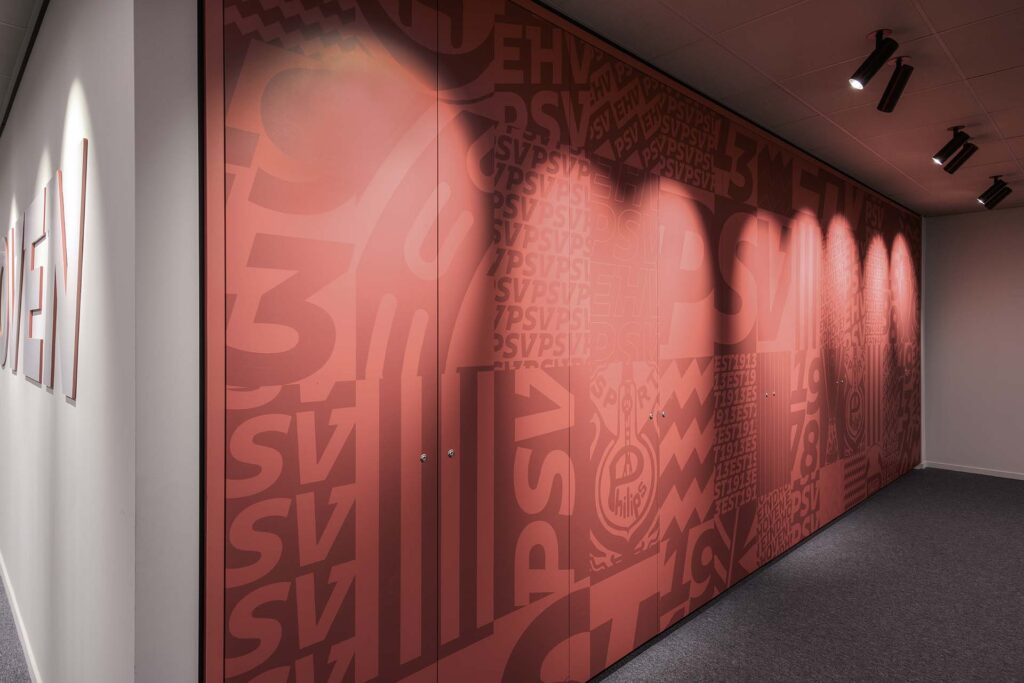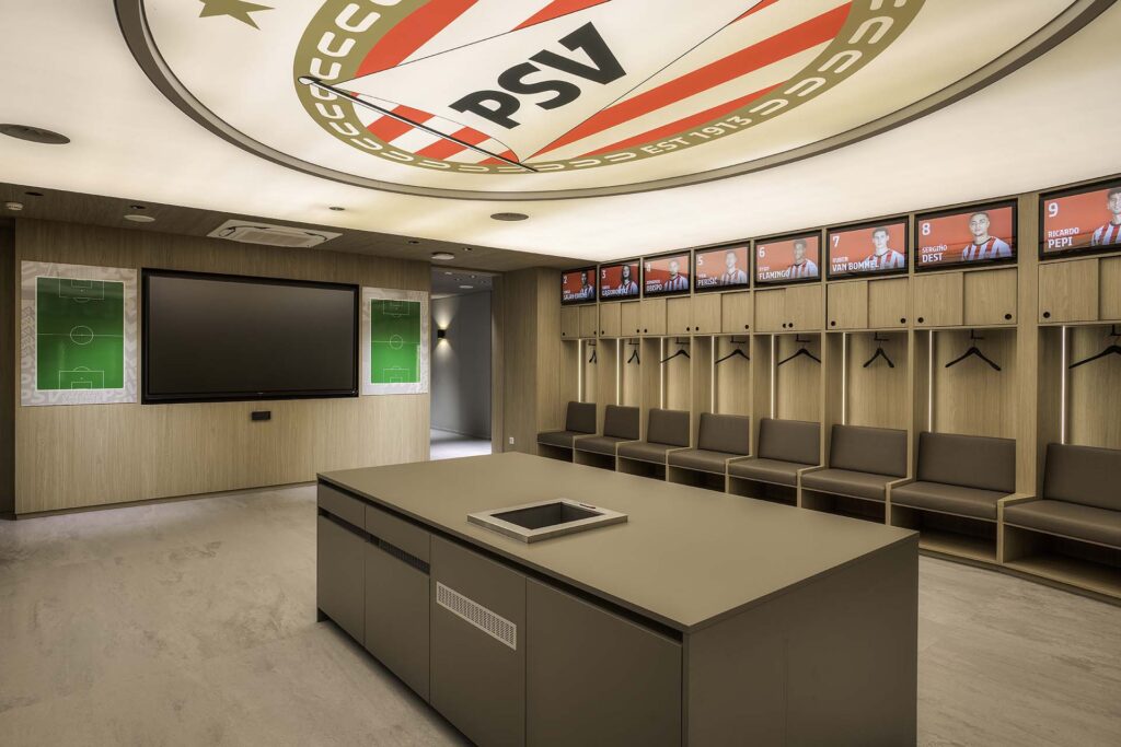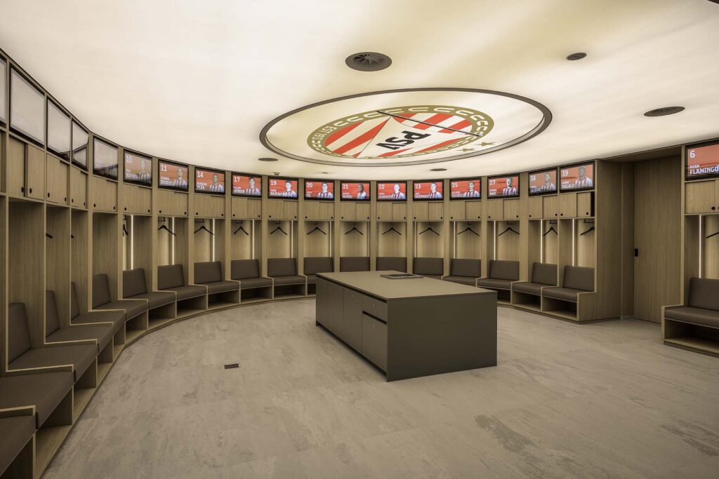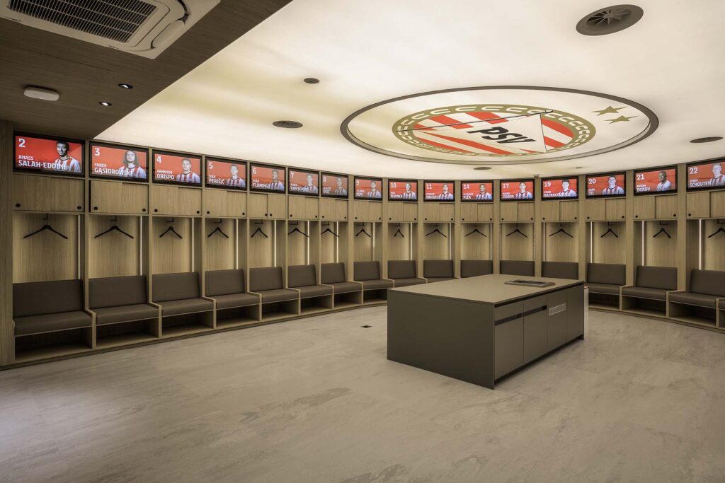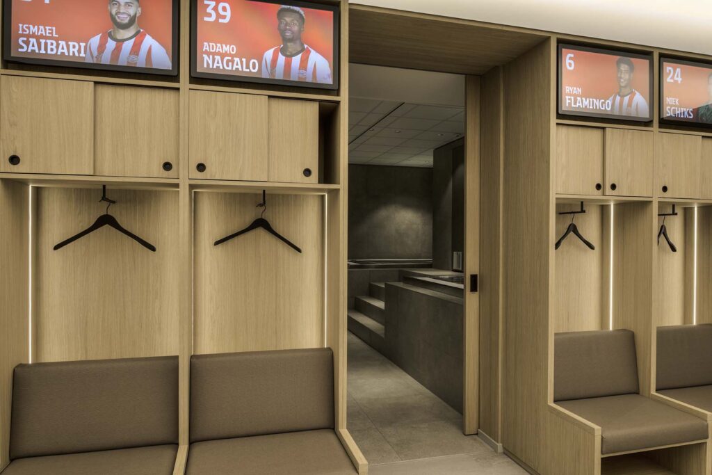De kleedlokalen zijn ontworpen in de herkenbare huisstijl van PSV en stralen professionaliteit en rust uit. Ze zijn uitgerust met hoogwaardige, gestoffeerde zitjes van Unilin, gecombineerd met slimme, functionele wandkasten en op maat gemaakte bureaus. Alles is tot in detail afgestemd op gebruiksgemak én uitstraling.