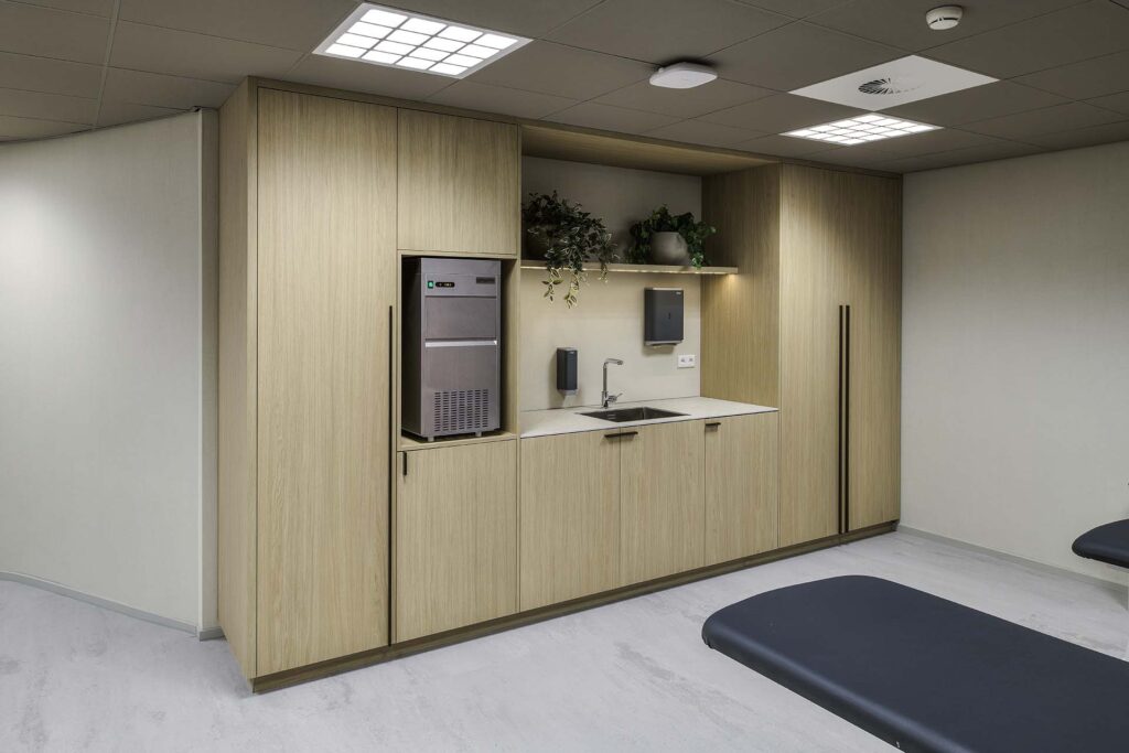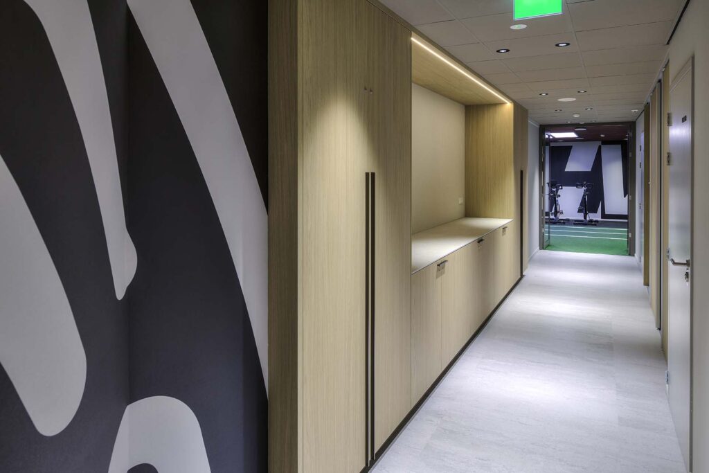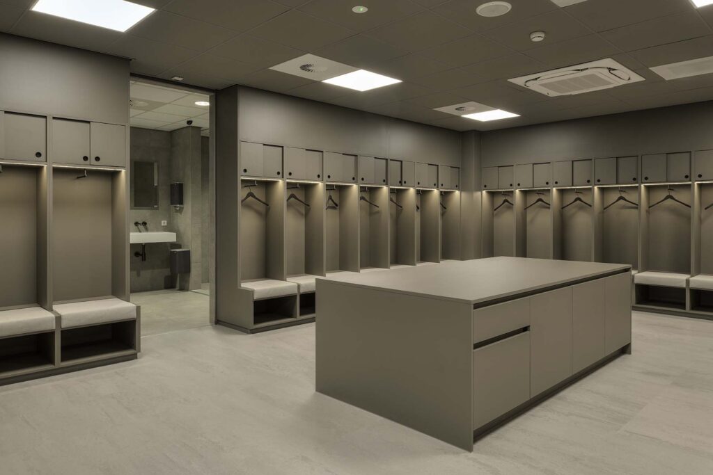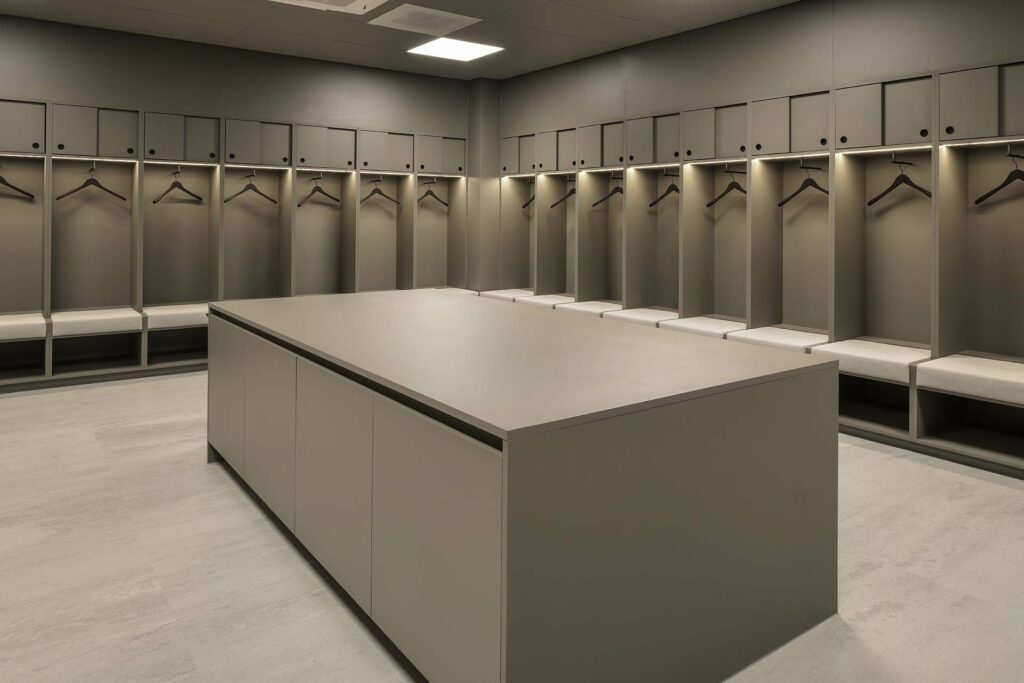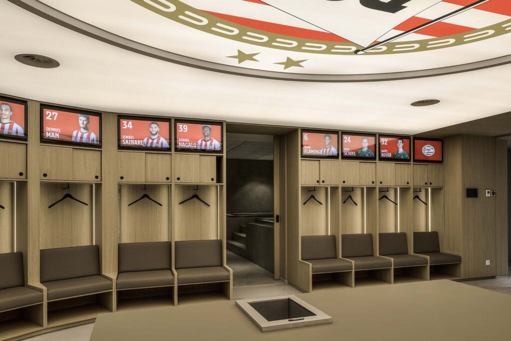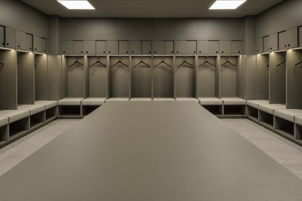 De kleedlokalen zijn ontworpen in de herkenbare huisstijl van PSV en stralen professionaliteit en rust uit. Ze zijn uitgerust met hoogwaardige, gestoffeerde zitjes van Unilin, gecombineerd met slimme, functionele wandkasten en op maat gemaakte bureaus. Alles is tot in detail afgestemd op gebruiksgemak én uitstraling.