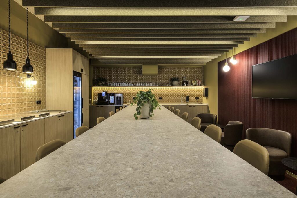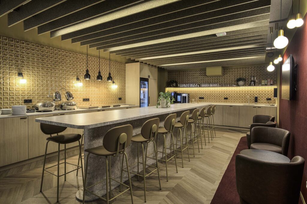 De aangrenzende tribune vormt een natuurlijke verlenging van deze ruimtes. Het is een plek waar ontmoeten, overleggen en werken moeiteloos samenkomen in een inspirerende setting. Dankzij het doordachte ontwerp sluit alles naadloos op elkaar aan.