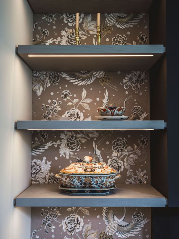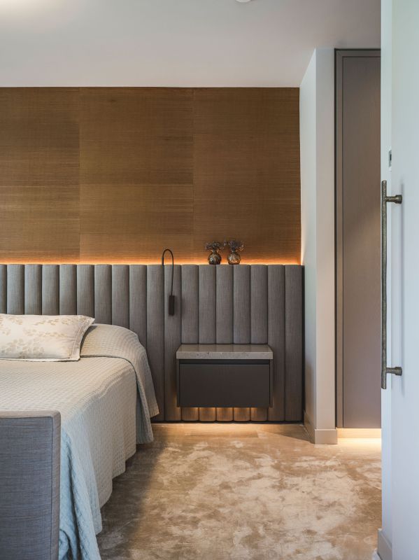 Voor het houtwerk is een speciale lakkleur ontwikkeld en vakkundig door ons aangebracht, waardoor het interieur een exclusieve en consistente uitstraling heeft. De bedachterwand is uitgevoerd in dezelfde stof als het bestaande bed, wat een luxe en samenhangend gevoel geeft. De lattenwand voegt een speels en elegant detail toe dat de woning karakter en dynamiek geeft.