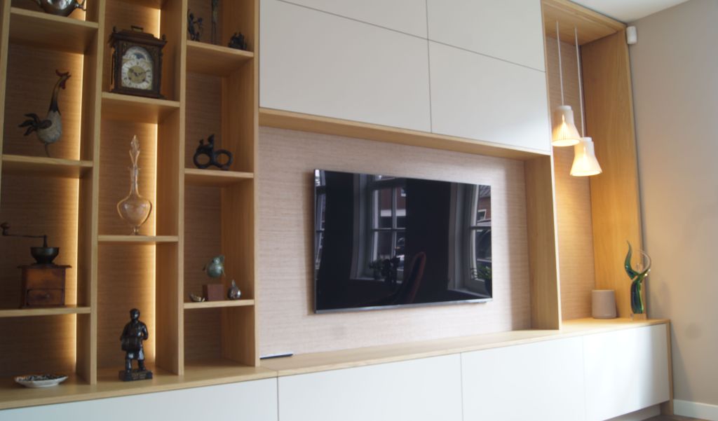 Voor dit project heeft Van Hoof Interieurbouw een stijlvol maatwerkwandmeubel met geïntegreerde nis en bureau gerealiseerd, waarin functionaliteit en uitstraling perfect samenkomen.
