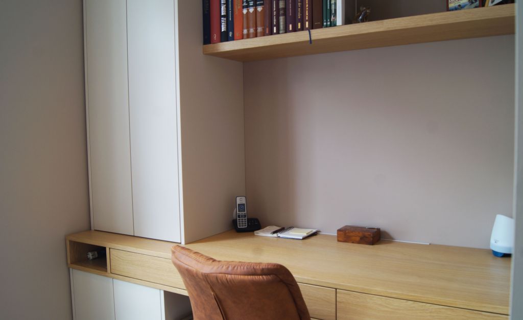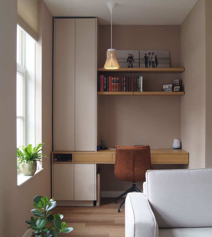 De nis met bureau sluit hier naadloos op aan en is eveneens uitgevoerd in Finsa Nude, gecombineerd met eiken fineer voor het werkblad en de schappen. Met drie handige lades biedt deze werkplek volop opbergruimte en comfort.