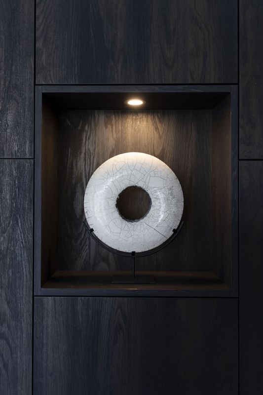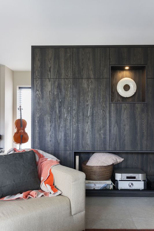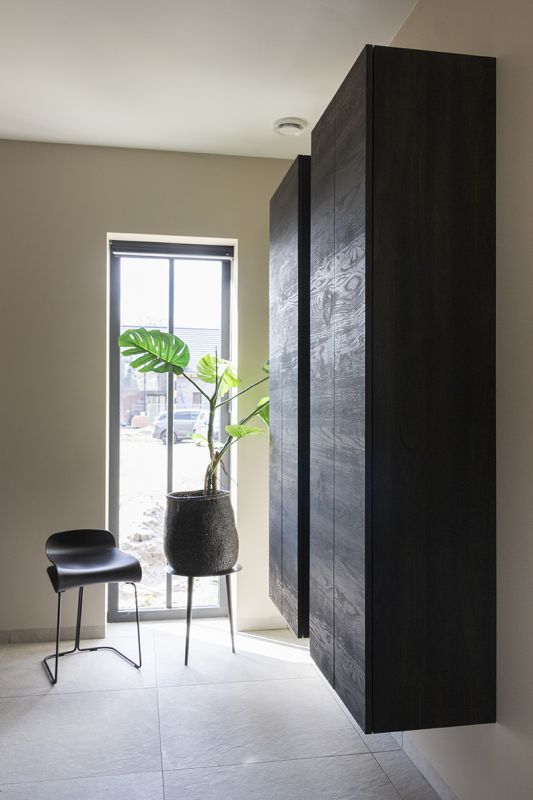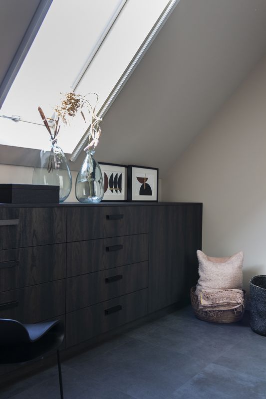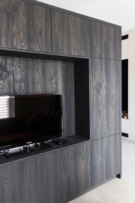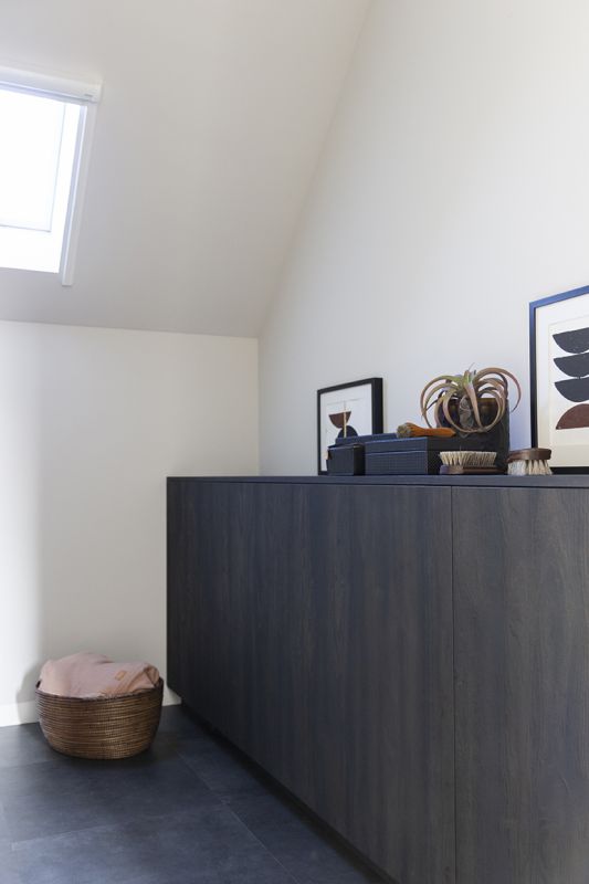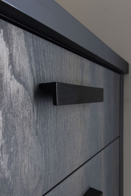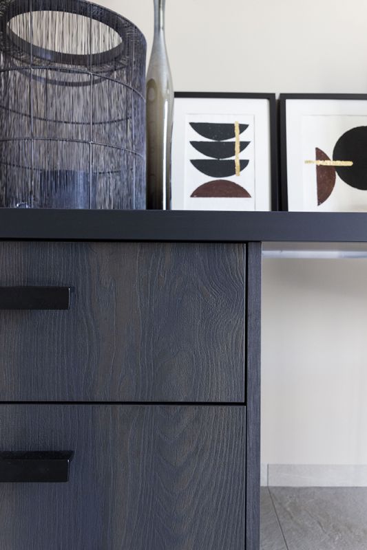De antracietkleurige binnenkasten vormen een rustige en strakke basis, terwijl de fronten in decorhout warmte en karakter toevoegen. Greeploze oplossingen met tip-on bediening, hoogwaardige lade- en scharniersystemen, en strak afgewerkte plinten en paslatten zorgen voor een verzorgd en tijdloos geheel.